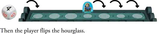 Important: If the player rolls a red number (5 or 6), for the time being the boss remains where he is and the player only flips the hourglass.