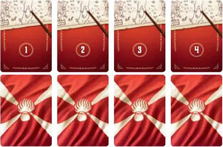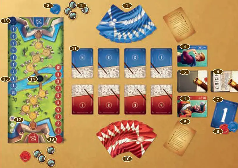 Place the game board in the middle of the table. Make sure the flag of your color is nearest to you.
