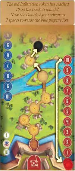As soon as your Infiltration marker reaches 10 on the track, you have successfully infiltrated the enemy and gained influence over the Double Agent. Return your Infiltration marker to '0'.