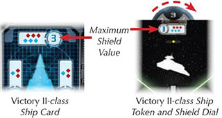 Prepare Ships: For each ship, place a speed dial set to "2" near that ship's card. Then set all four of its shield dials to the maximum values shown on its ship card. Then place one command dial near the CR90 Corvette A ship card, two command dials near the Nebulon-B Escort Frigate ship card, and three command dials near the Victory II-class ship card.