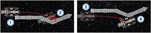 The Rebel player realizes that if he moves the ship to the joint below the "3" speed number, it will overlap the maneuver tool at that position. He must place the maneuver tool on the other side of the ship instead.