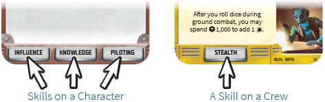 Characters and crew can have training in a variety of different skills, from Piloting to Tech. A character's skills define the sorts of things that the character is experienced in doing. For example, a character with the Piloting skill is a veteran pilot who can usually outmaneuver their enemies.