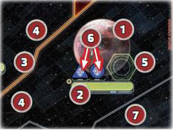 1, the system's name2, space area surrounding it3, and its borders4. Ground units in the system are placed on the planet art, while ships are placed in the space area around the planet.There are eight regions of the game board, separated from each other by large orange borders. Each region contains four systems.