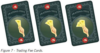 Note: If players do not have the funds to pay for the trading fee, they must keep the card, placing it face-up in front of them. Any trading fees held this way must be paid immediately upon receiving enough money.