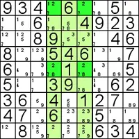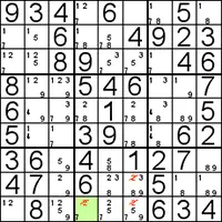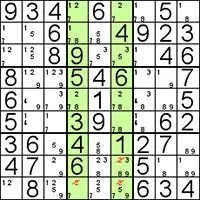Doordat het boven blok, de kandidaten in dezelfde lijnen optreden, kunnen we de 2's in het onderste blok elimineren. |