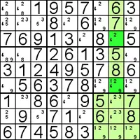 We kunnen nu de andere 4 in de verticale lijn buiten vak 9 elimineren. Door het elimineren hebben we nu een enkele kandidaat nummer 2, in de rechter bovenvak. |