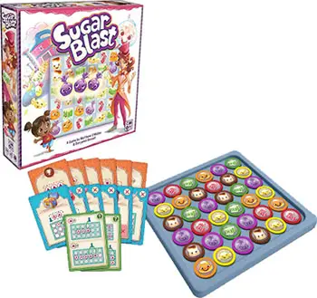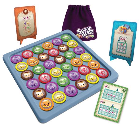 In Sugar Blast, players match chips on a constantly changing board, collecting different types of Candy to complete a unique Objective card. If you are the first player to complete the Objective, you win!