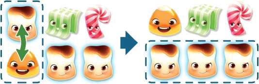Example: It's Sally's turn, so she looks for a Blast she can create: She sees a Marshmallow candy near 2 other Marshmallow Candies, so she chooses to swap the Marshmallow Candy with a Corn Candy next to it.