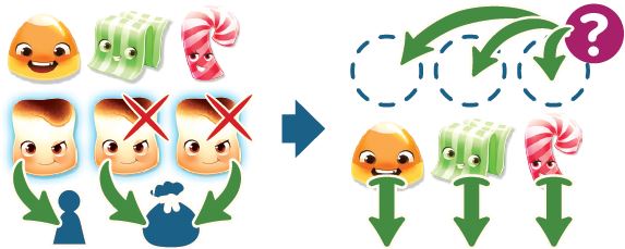 Remove the matching Candies from the board. Keep 1 in front of you, and place the rest in the bag.