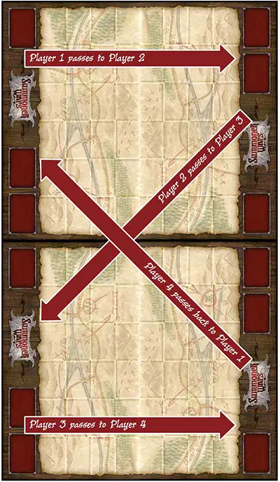 To play a game with 3-4 players start by placing 2 Battlefields next to each other as shown in the example on page 20 of this rulebook.