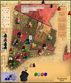 Tammany Hall was the political machine that dominated New York City politics by organizing the immigrant populations. While the organization's influence spanned from its founding in the 1790s to its collapse in the 1960s, this game is set in lower Manhattan roughly between 1850 and 1870 - the era of Boss Tweed.