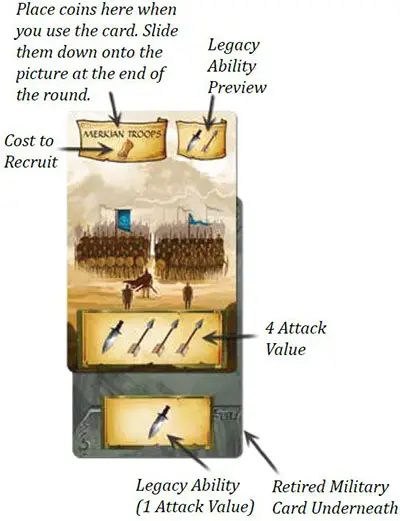 When a player uses a military card, they place their payment in coins on the name area of the card. This indicates that the military card has been used this round and may not be used again until the next round.