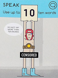 The performer now draws one CENSORED card and reads it aloud. This card directs the performer to DRAW, ACT, or SPEAK clues, and includes rules the performer must follow (e.g. must speak - using only ten words or less).