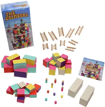 Each player randomly chooses a Climber and takes the corresponding blocking disk, plus one short ladder and one long ladder.