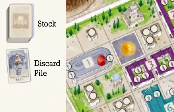Note: The Pompeji game board is divided into squares. Some buildings are one square big (e.g. the building number 9); others stretch across two squares (e.g. building number 2). Therefore, it is important that you put the game pieces exactly on the small, round spaces within the buildings. No player may put game pieces into buildings without such spaces.