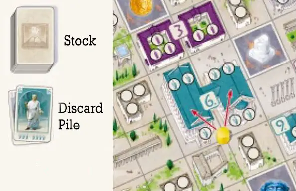 Example: Oliver plays a turquoise card with the number 6.He can choose on which of the two buildings to put his yellow game piece.He chooses the building with the three spaces,then draws a new card off the stock.