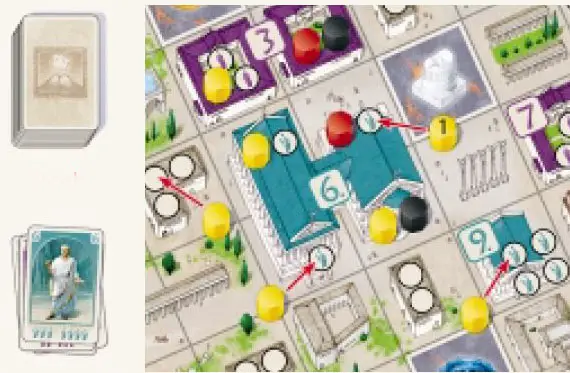 Important: The house numbers 3,4,6,8,10 and 11 each mark two buildings.When playing a card with any of these numbers, the player chooses a free round space in either of the two buildings belonging to this number.