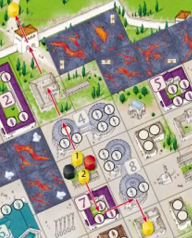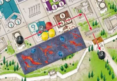 The other players follow clockwise,drawing and placing one lava tile each until there are six tiles on the board.If a player puts a lava tile onto a city square (regardless of whether it shows a whole building or only half a building) on which there are game pieces, these are thrown into the volcano.