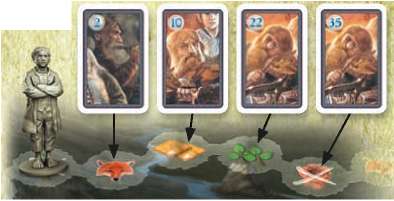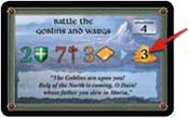 Now players in turn try to win the number of jewels marked on the right hand side of an Adventure card (see red arrow in card illustration to the right).
