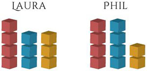 These are Laura and Phil's Followers at the end of a game. If the Scots control the board, then Phil has won as he has more blue Followers.