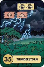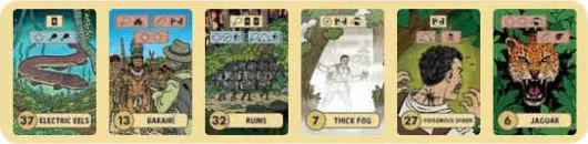 The core of the game is the adventure cards. Each one represents an encounter in the jungle. To succeed you'll have to make sure these encounters happen in an order which the explorers can survive. Sometimes the cards will be obviously positive or negative, but usually they will be a mix of both. Each card has a name and a number (on the bottom), and a series of caption boxes (near the top).