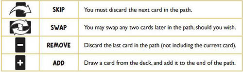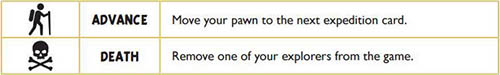 Each caption box has a number of symbols. These symbols are also listed on the player aids and at the back of this rulebook. About half relate to Expertise and Resources, while the others affect the path of cards itself, or the expedition as a whole. Each Resource and Expertise symbol has two versions: gain and spend.