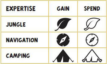 You'll have to make the best use of your Expertise and Resources to survive as you head deeper into the jungle. Resources are represented by tokens. Expertise is represented by symbols on the cards. There are three types of each: