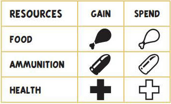 When you gain or spend a Resource, you take the matching token from the supply and put it in your team area, or vice-versa. Each explorer cannot go above four Health, but there is no upper limit to Food and Ammunition. If you need to spend a Food and have none remaining, you must spend one Health instead. The Health token can be taken from any living explorer. If you have no