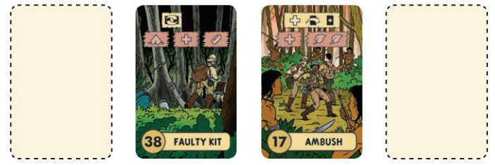 Lay out all nine expedition cards in the centre of the table, ending in the lost city, and place a pawn on the first expedition card. Shuffle the adventure cards and deal yourself six. In this version the rules for Morning and Evening are slightly different.