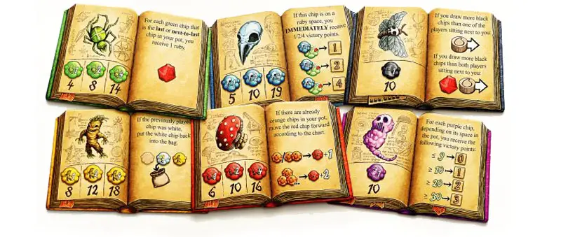 Bonus: In Evaluation Phase B, check if all the white chips in your pot amount to exactly 7. If they do, add up the value of all the green chips in your pot and then move your very last chip that many spaces forward. For example, if you have 3 green chips in your pot with a total value of 6, you can move your last chip (regardless of its color) another 6 spaces.
