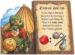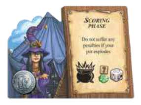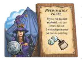 Action: During the Evaluation Phase, if your pot exploded, use this herb witch to get victory points and to buy chips (normally you have to choose one or the other).