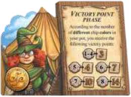 Example: If you draw a blue 4-chip, and there are 4 or more orange chips in your pot, then receive 4 victory points. If you draw a blue 4-chip and there are 3 or fewer orange chips in your pot, you do not receive any victory points.