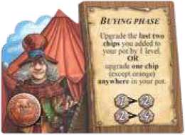Action: During the Buy Chips Phase, use this herb witch to up- grade the last 2 chips you added to your pot by 1 level, OR upgrade 1 chip anywhere in your pot by 1 level.
