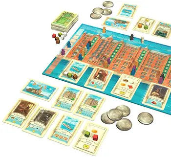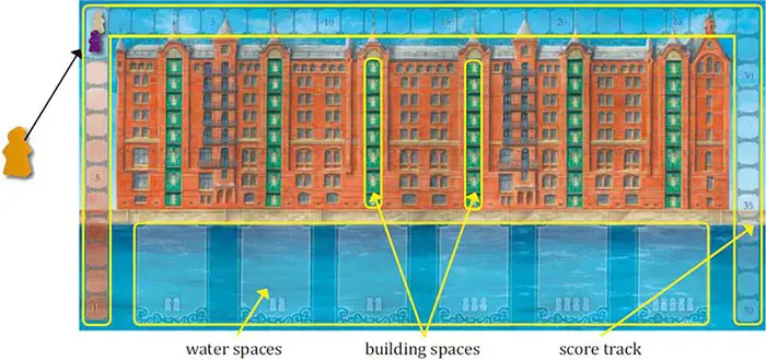 First, place the game board in the center of the playing area. It shows a part of Hamburg's warehouse district, the Speicherstadt, and includes water spaces and building spaces, as well as a score track.