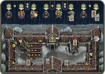 Place the Schnapps Tiles in the 3 recesses in the Monastery Board so that the schnapps are not visible. Place the 16 Bard Cards face up in a stack next to the Beer Merchants in the open display.