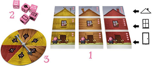 Set the 36 House tiles in the center of the table, in three columns (straw, wood, brick). Each column has three rows: a Door stack, a Window stack, and a Roof stack. Shuffle each stack before starting the game.