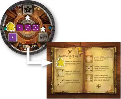 Each player has a spellbook with 6 SPELLS. As you play, you will mark spells as ACTIVE by placing your meeples on them. (You can only mark spells by gaining various pillar bonuses).