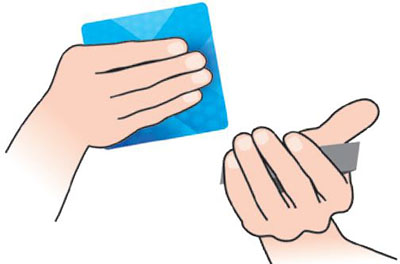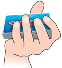 He takes the deck of question cards in his left hand. He places the cards face-down, so the questions are not visible.