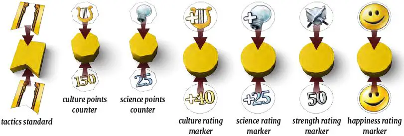 The round markers are used to indicate four ratings of each player's civilization: culture production, science production, military strength, and happiness.