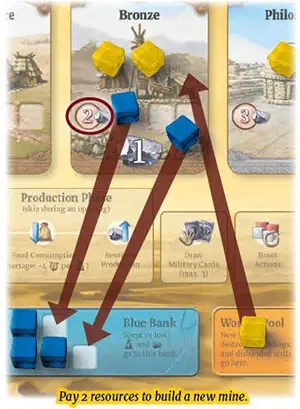 An Age A farm or mine costs 2 resources, as specified by the Agriculture or Bronze card. Your Bronze card has 2 blue tokens from your first turn's production. Each is worth 1 resource, as specified by the