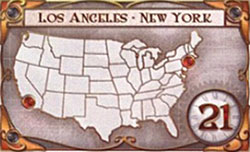 Elk bestemmingskaart bevat de naam van twee steden op de kaart en de waarde van de punten die het oplevert als die route voltooit kan worden.