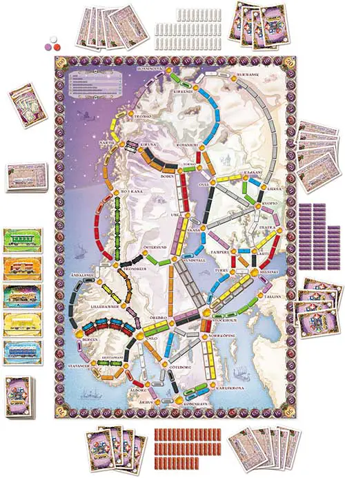 Shuffle the Destination Ticket cards and deal 5 cards to each player. The Destination Ticket deck is then placed next to the board. Each player looks at their Destination Tickets and decides which ones they wish to keep.
