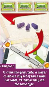 The player may claim a route on the board by playing a set of Train Car cards that match the color and length of the route and then placing one of his colored trains on each space of that route.