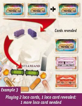 For each card revealed whose color matches the color used to claim the Tunnel (including locomotives), an additional card of the same color (or a locomotive) must be played to successfully claim the Tunnel. See Examples 1 and 2.