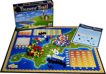 Example: In the first turn the total shown on the dice for tin is two. As it is the first turn one is added to this, making a total of three. A white cube is placed in the £4 box for tin.