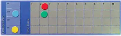 Each action takes an amount of time to perform. The amount of time each action takes varies, as shown on the Action Display. Each player has ten Time Points to spend on actions during this phase. Players record the amount of Time Points they have used on the Time Track. The order of play is determined by how much time each player has spent during the phase.