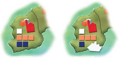 Example: Here we have a 'before' and after' example of placing an adit. One water cube has been removed from each area and a tin and copper cube has been added to each area.