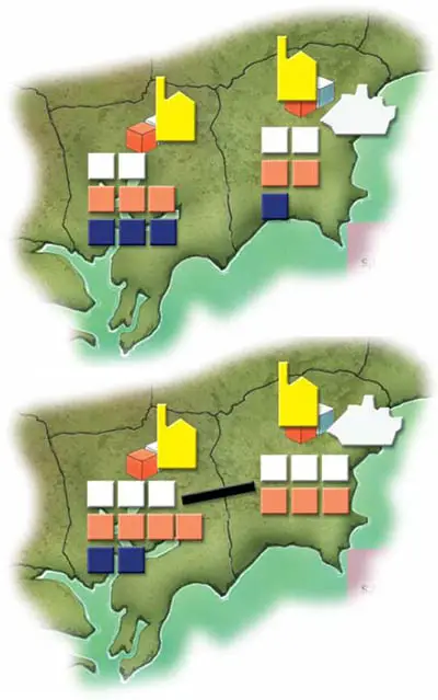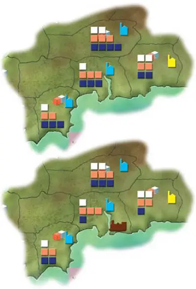 Example: In example above blue places a train in the area indicated. Two water cubes are removed from that area, and one from each adjacent area. The Mining Capacity in the area with the train will now be three.