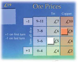 In following turns the old price may affect the new price of ore. If the old price was at the highest level then subtract one from the total shown on the dice. If the old price was at the lowest level then add one to the result shown on the dice.