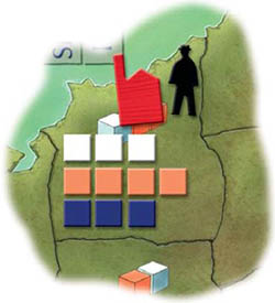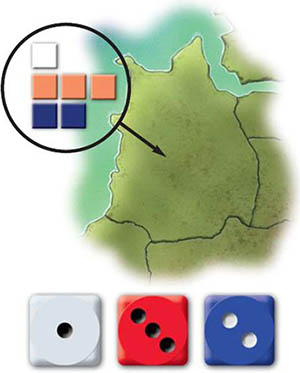 The first player on the Order of Play column must choose one clear area, (one with neither ore cubes nor a mine). He rolls the three special dice and places cubes in the area according to the roll.